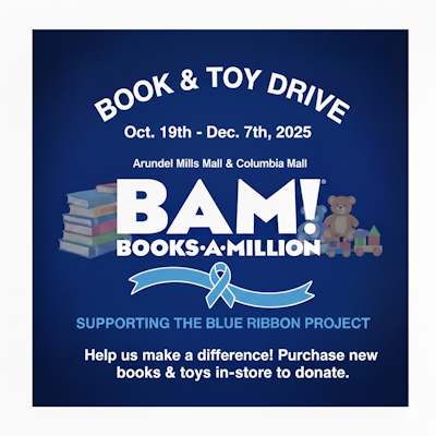 This holiday season, The Blue Ribbon Project is honored to be selected as the featured local nonprofit partner for the 2025 Books-A-Million Holiday Book and Toy Drive at both Arundel Mills and Columbia Mall locations. From October 19th until December 7th, 2025, customers at Books-A-Million can purchase and donate new books, toys, and other gifts that will be delivered directly to children and youth in foster care and those impacted by child abuse throughout Maryland.